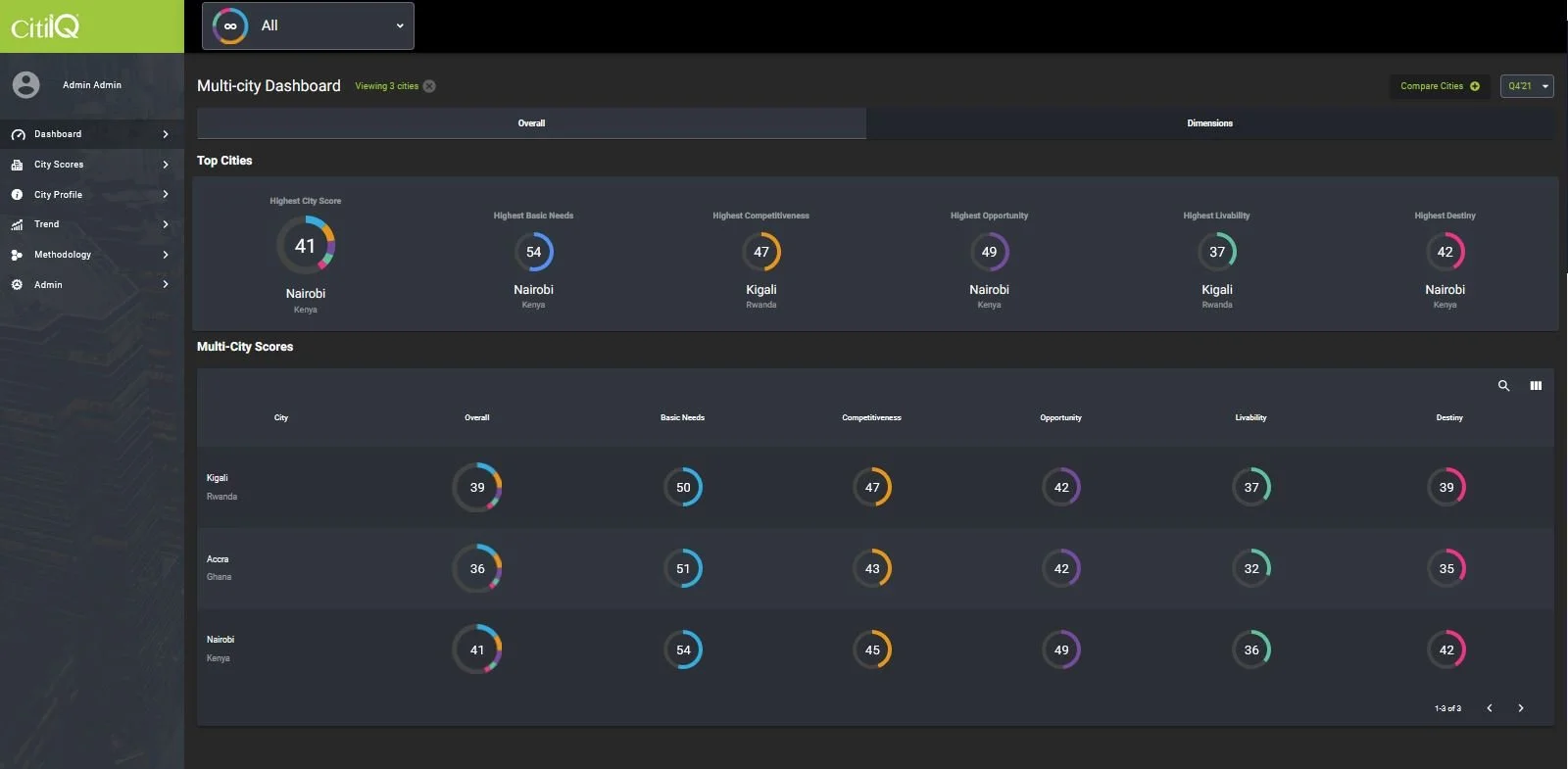 This is a selection of key cities representing major or capital centres for respective countries. It is only the beginning of the effort to provide stable, accurate and accessible data for a wide range of African cities. Intermediate cities, those cities that are not capital cities or the largest cities in a country, will make a critical difference in the future of human well-being in Africa. CitiIQ begins by scoring these cities. This opens a path for the cities and communities to deepen their local autonomy through measurement of meaningful progress. The initial group of cities can be seen by signing in to the dashboard. Cities can be compared, examined at increasing levels of detail, and monitored for change over time. Each of these functions has great potential to foster meaningful, positive impact.