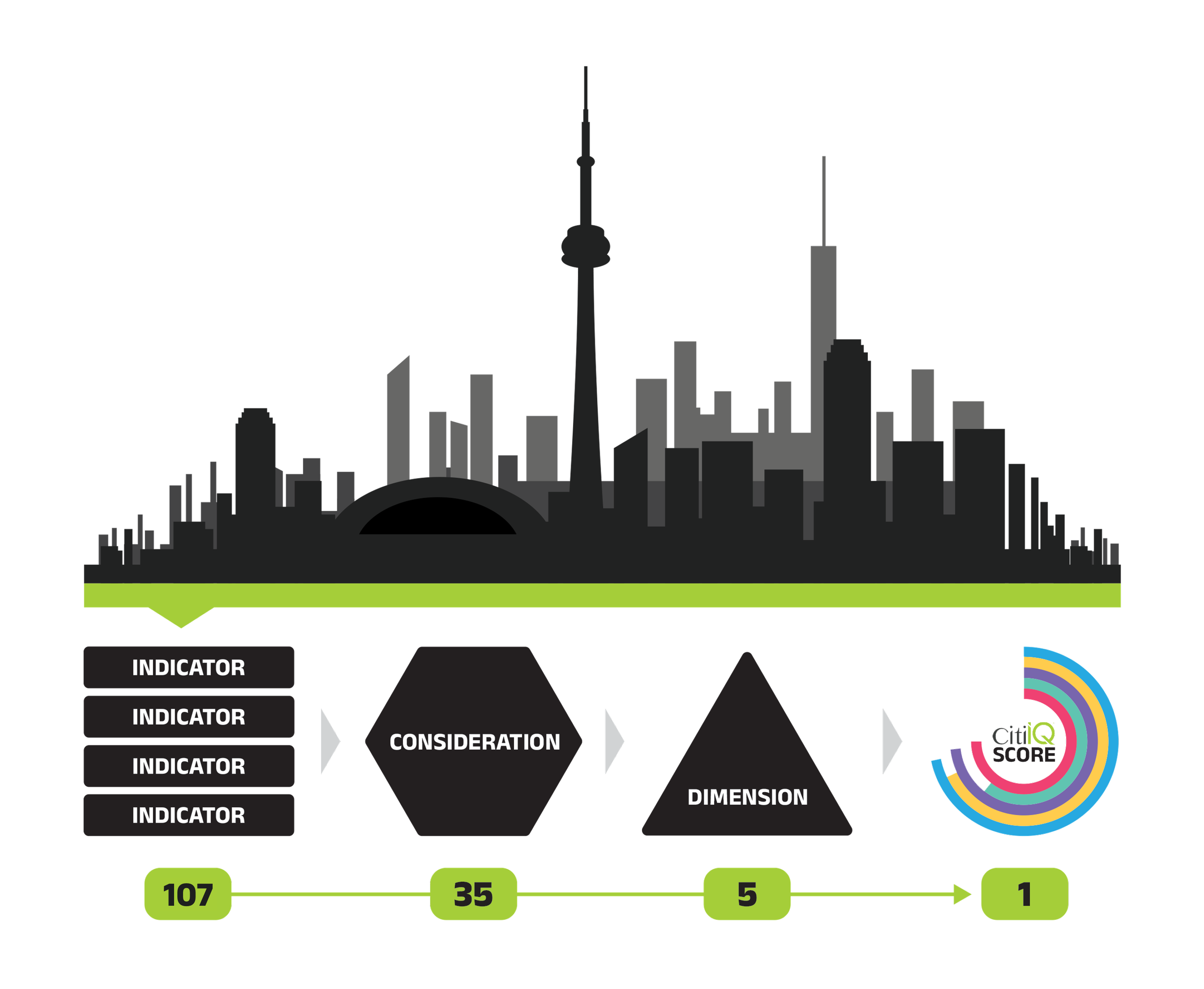The CitiIQ measurement system encompasses the economic, environmental, social and cultural infrastructures of a city and has organized 35 imperatives, called Considerations into a hierarchical pyramid inspired by Abraham Maslow’s theory of human motivation.